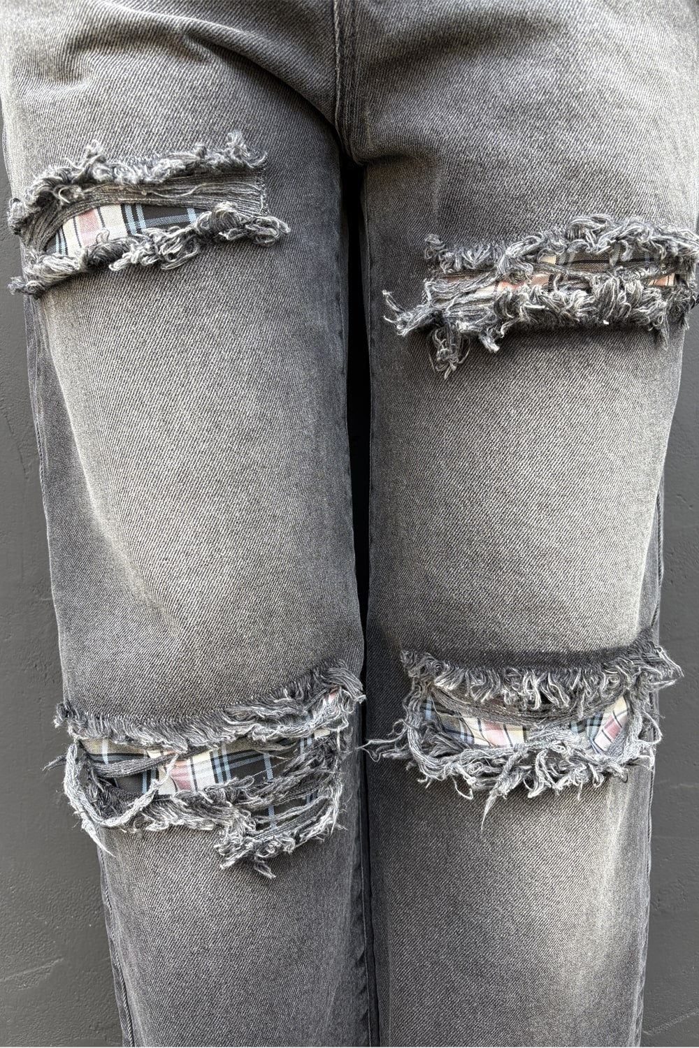 Rupturile frontale sunt dublate cu material din bumbac în carouri, oferind un efect vizual statement.