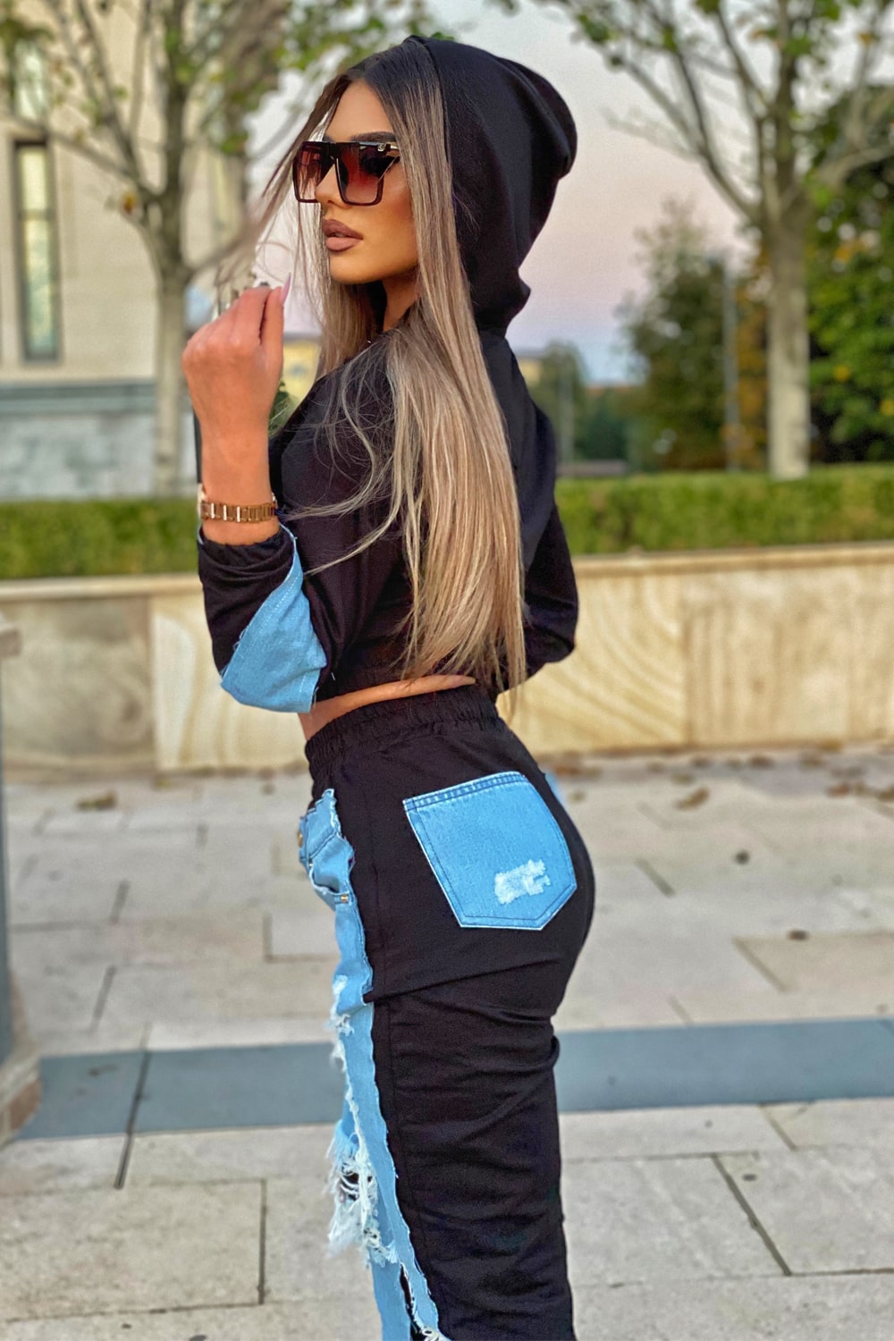 Hanoracul: are aplicate repere din denim care sporesc aspectul casual chic; gluga este un accesoriu ideal pentru zilele racoroase. Inchiderea cufermoar il face practic, usor de purtat.