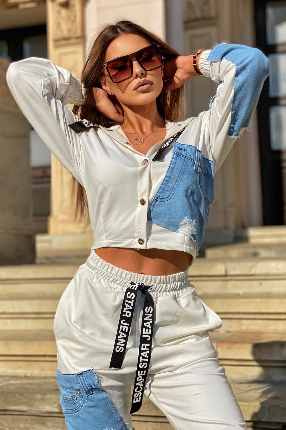 Acest trening dama bumbac alb si denim cu buzunare si butoni, din doua piese este un melanj perfect intre modern si confort, fiind conceput pentru femeile active care apreciază atât stilul cât și funcționalitatea în vestimentația lor de zi cu zi.
